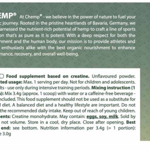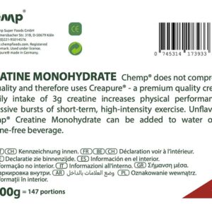 Wir präsentieren Chemp Kreatin 500g mit Creapure® – die erstklassige Wahl für Fitnessbegeisterte, die ein Kreatinsupplement von höchster Qualität suchen. Creapure®, in Deutschland bezogen und hergestellt, ist weltweit für seine unerreichte Reinheit, Konsistenz und Wirksamkeit bekannt. Jede Portion liefert 100% reines Kreatin-Monohydrat, das zur Steigerung der Muskelkraft, zur Leistungsverbesserung und zur Beschleunigung der Regeneration beiträgt.